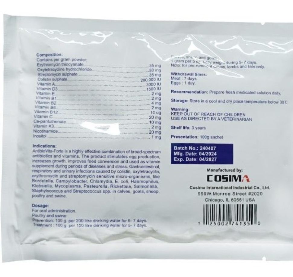 پودر آنتی بیو ویتافورت کوزیمو ترکیب بسیار کارامد از طیف گسترده ای از آنتی بیوتیک ها و ویتامین ها.
